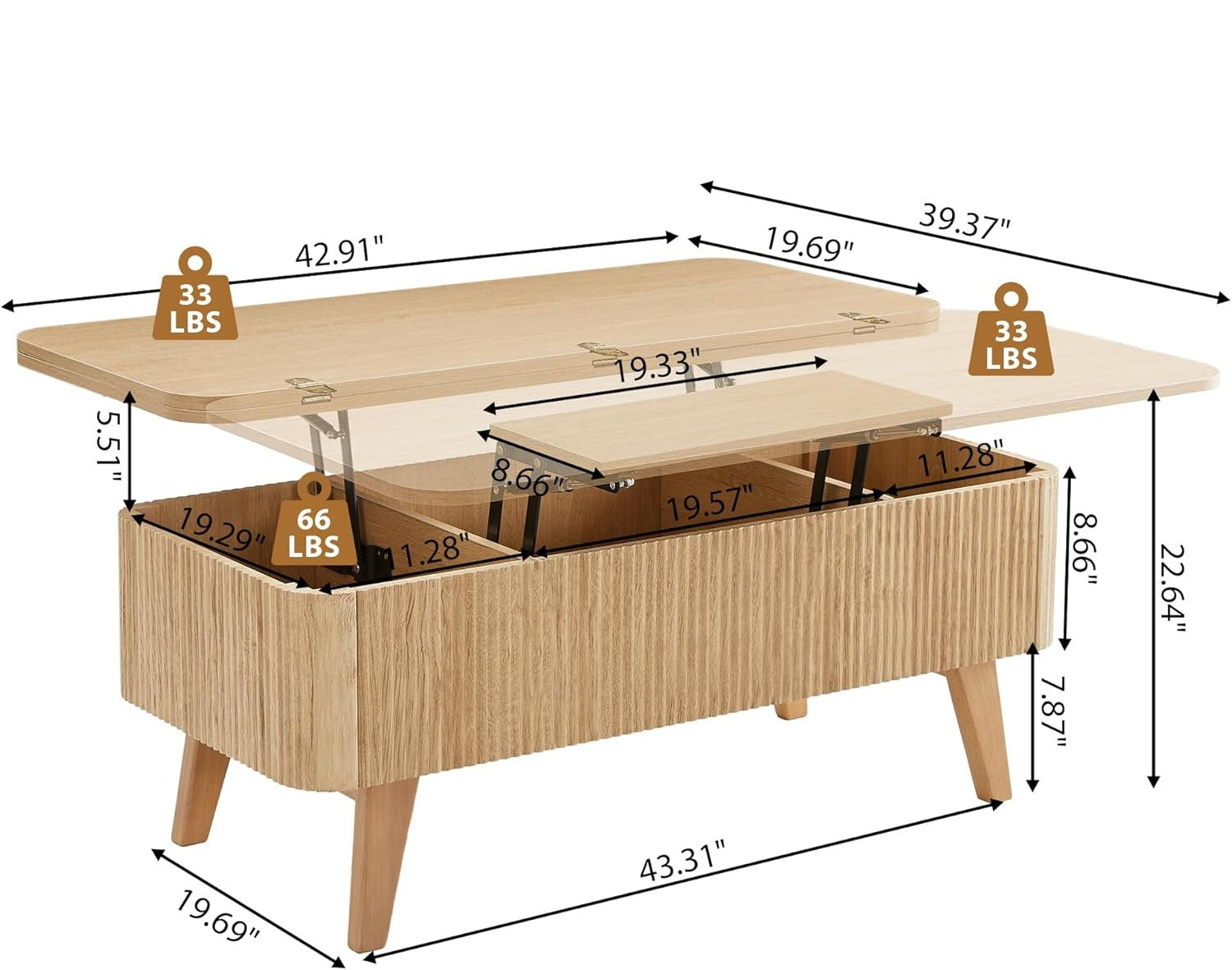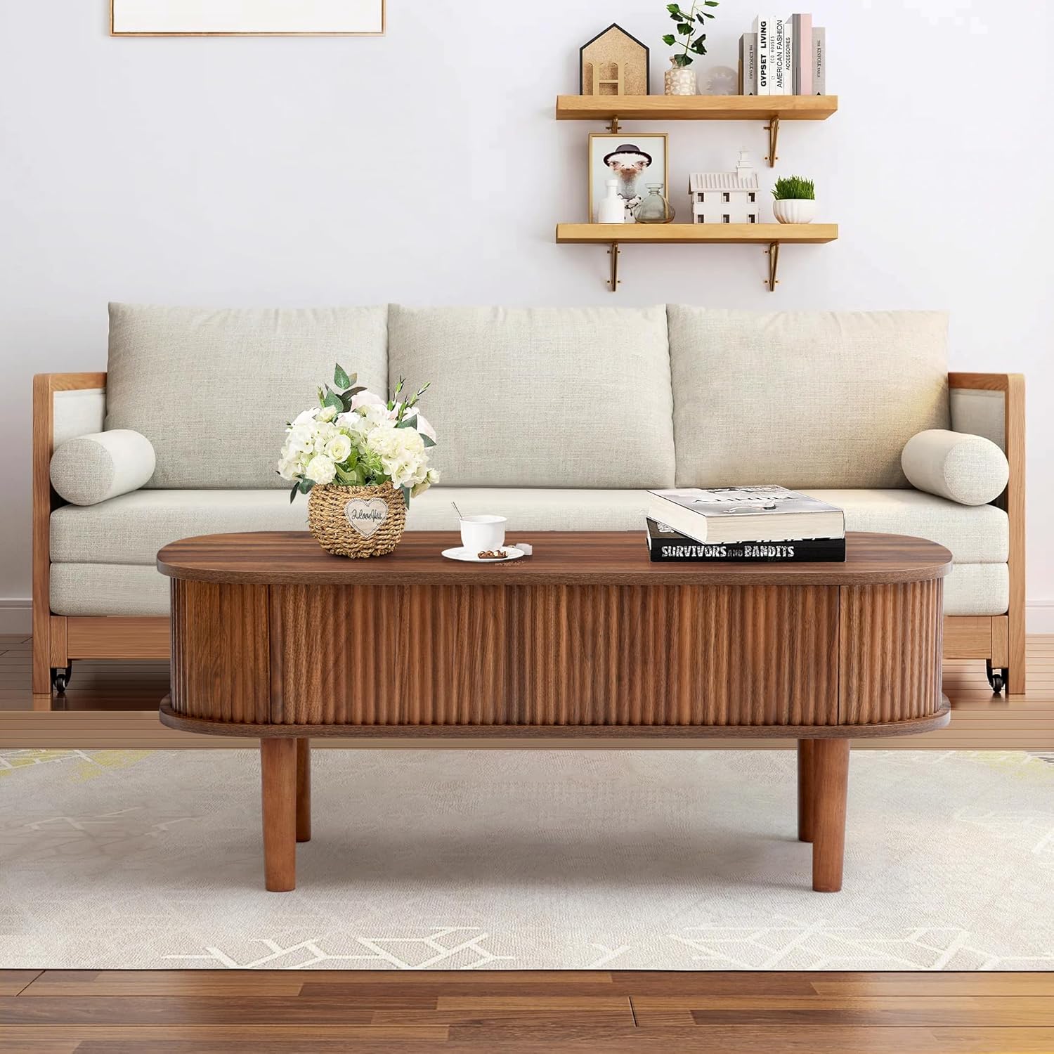 Streamlined 43″ × 20″ footprint, this coffee table is thoughtfully sized to fit comfortably in living rooms, apartments, and multifunctional spaces.